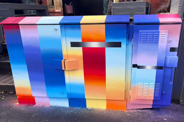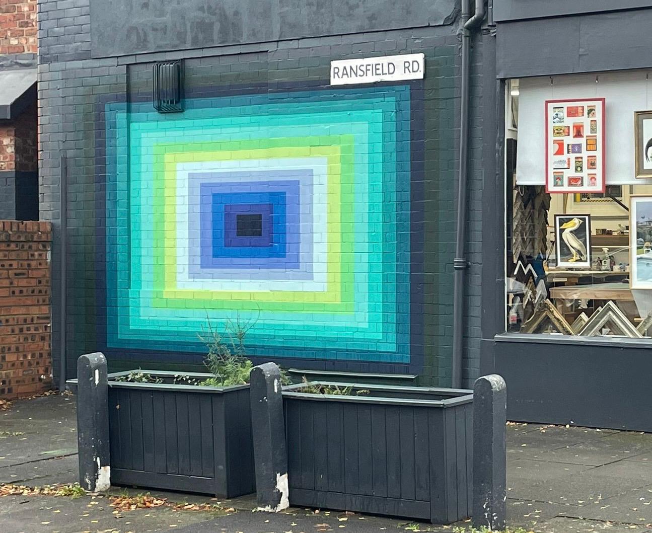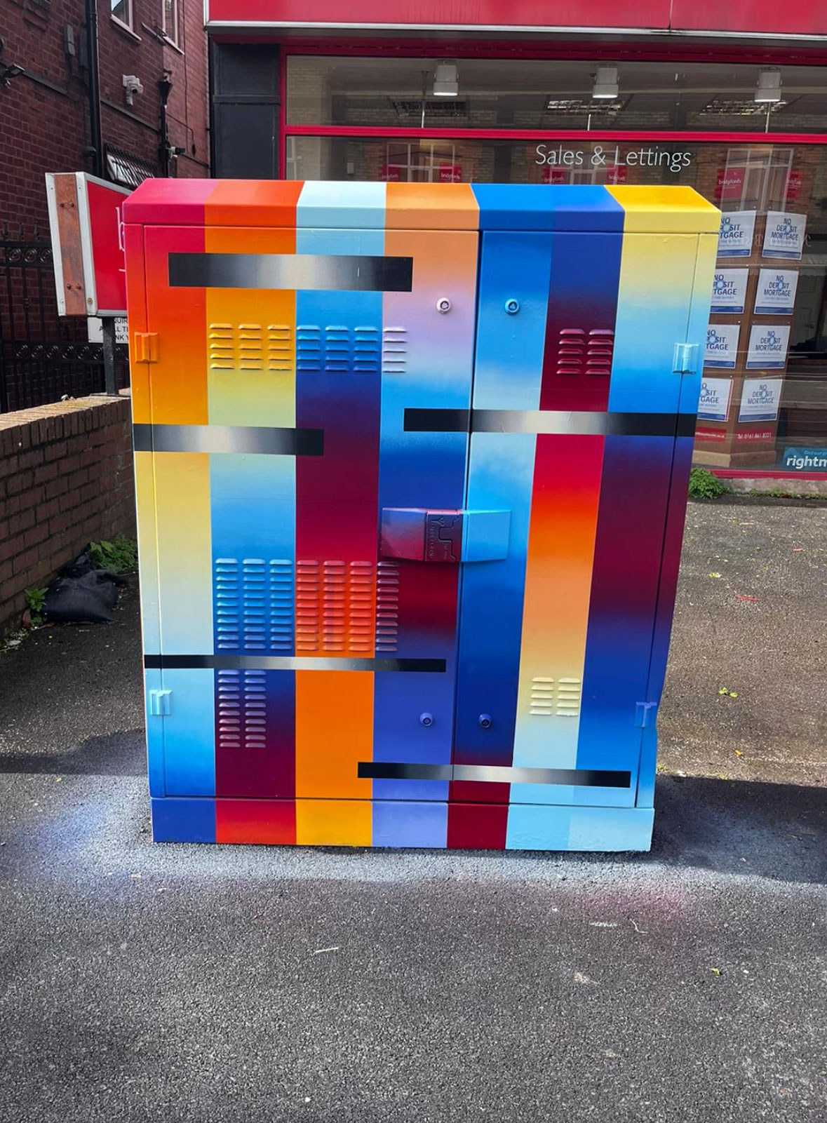 In Chorlton: see Callum’s work on two Barlow Moor Road junction boxes, at the junction with Groby Road. We also have the glorious concentric splash of colour on the junction box on Wilbraham Road, near the Lloyds and the fabulous frame at Framing Manchester on Manchester Road.