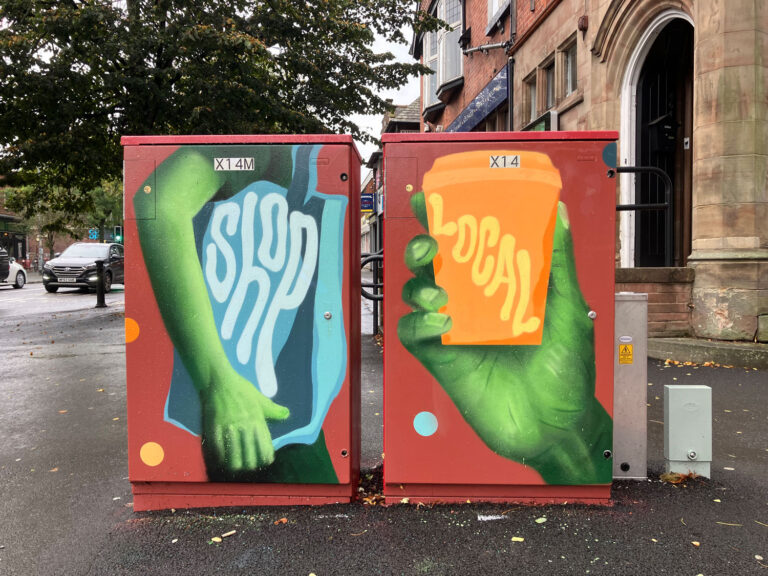 In Chorlton, you’ll find his work on junction boxes on Wilbraham Road and he’s recently completed the lift shaft at St Werburgh’s Road tram stop.